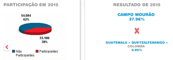 Apesar da mobilização ter sido a menor em 13 anos de participação (37,96%), Campo Mourão venceu o Dia do Desafio deste ano. O resultado da concorrente Colomba (Guatemala) saiu nessa segunda-feira: 0,85%. Isso mesmo: os guatemaltecos não mobilizaram nem 1% da população em alguma atividade física. Ai-aiai-aiai! Digamos que o povo de Colomba está devagar, quase parando...