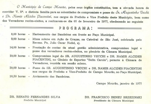 Mais uma do baú do historiador Jair Elias dos Santos Jr. O convite para a posse, em 1 de fevereiro de 1977, do prefeito eleito Augustinho Vecchi. O vice que assumiu com ele foi Namir Piacentini. O convite é assinado pelo prefeito que estava se despedindo, Renato Fernandes Silva, e pelo presidente da Câmara, Irineu Brzezinski. Foi a única vez que a posse ocorreu no ginásio Belin Carolo, que tinha sido inaugurado nos Jogos Abertos de 1976. Repare que a posse mesmo foi à noite, mas pela manhã teve missa em ação de graças e, à tarde, prestação de contas do Silva na Câmara.