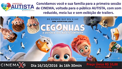 O Cinemax’s vai exibir no próximo domingo (16h30) a animação “Cegonhas” numa sessão voltada para o público autista. O filme terá som reduzido, meia luz e não haverá exibição de trailers A promoção é da Amigos do Autista de Campo Mourão. Crianças autistas terão entrada franca. Acompanhantes pagarão meia – R$ 10.