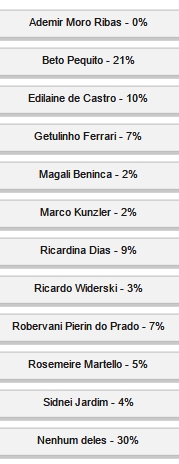 Getulinho Ferrari (Coordenação) e Robervani Pierin do Prado (Procuradoria) tiveram 7% cada.