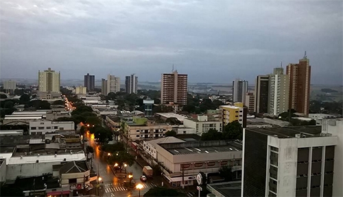 Vista de Campo Mourão, às 7h10 desta sexta-feira. A cidade amanheceu com uma garoazinha. Segundo o Simepar vai chover de novo nesta sexta-fera. São pancadas pela manhã, chuvas e trovoadas à tarde e novamente pancadas à noite. Mas para por aí. A previsão fala em sol com poucas nuvens no sábado e domingo. Já na segunda-feira é solzão.