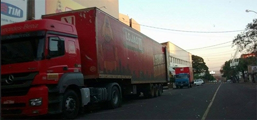 Olha o tamanho da carreta estacionada na rua São Paulo, entre as avenidas Capitão Índio Bandeira e Manoel Mendes de Camargo, no centrão de Campo Mourão. Foi nesta sexta-feira. Era hora de carga e descarga, mas não pra uma “carretinha” assim, né?...