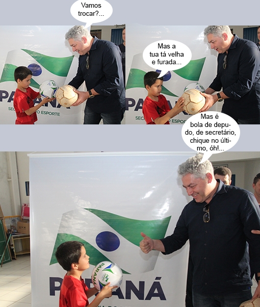 Os cliques são de Quarto Centenário, onde o secretário de Estado Douglas Fabrício (Esporte e Turismo) também foi fazer distribuição de kits de materiais esportivos. E dê-lhe bolas! No mais, que fique claro: diferente do que insinua o balãozinho, Douglas deu a bola nova para o menino...
