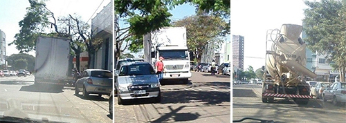 "Na rua Laurindo Borges, nesta quinta-feira, por volta das 10h, em menos de 100 metros dois caminhões parados em fila dupla. Um eu achei que ia tampar os buracos com concreto...”