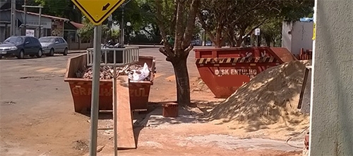 Não bastasse o material de construção, que infelizmente é comum ser colocado pelas calçadas de Campo Mourão, nesse caso da rua Rocha Pombo até a caçamba de entulhos foi parar onde não deveria.