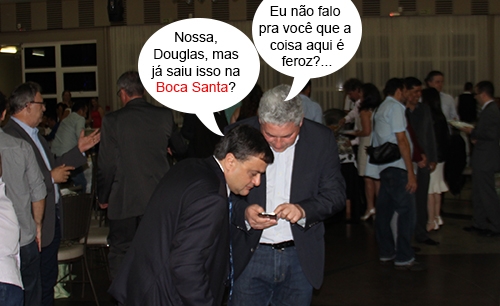 O clic é desta quinta-feira, durante o jantar dos 60 anos da Santa Casa. Sabe-se lá o que era, mas saiu alguma coisa no smartphone que o secretário Douglas Fabrício (Esporte e Turismo) quis mostrar para o colega Michele Caputo (Saúde). E, cá pra nós: Caputo quis ver bem de pertinho...