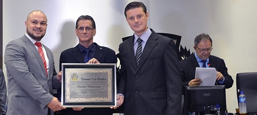 O empresário Osvaldo Guaiume recebeu a homenagem das mãos do autor Pedrinho Nespolo e do procurador geral da prefeitura, Márcio Berbet, que representou a prefeita Regina Dubuy.