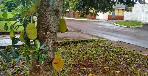 Na rua Interventor Manoel Ribas, perto do Tiro de Guerra de Campo Mourão, a arborização pública inclui um pé de jaca carregado.