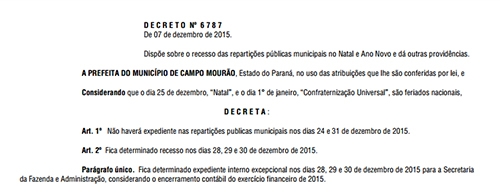 Saiu o decreto que define o expediente na prefeitura de Campo Mourão para este fim de ano.
