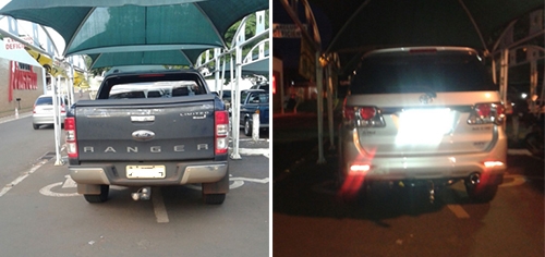 “Fotos desta segunda-feira, no estacionamento de um supermercado de Campo Mourão. Nos dois casos, um veículo só ocupou as duas vagas reservadas para deficientes”.