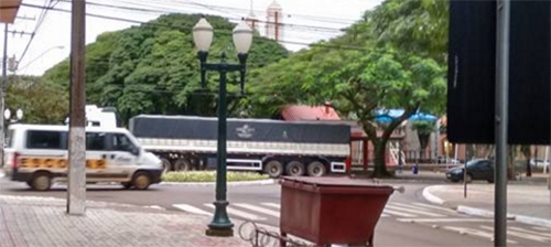 “Carreta cruza a av. Capitão Índio Bandeira, no centro de Campo Mourão (olha a Catedral ao fundo!), na manhã desta quinta-feira”.
