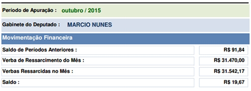 O gabinete do deputado Márcio Nunes gastou em outubro R$ 70 a mais que a verba indenizatória do mês.