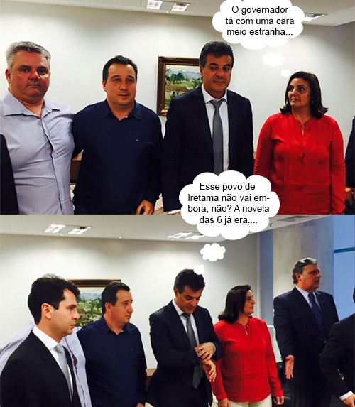Os cliques são da recente visita que uma caranava de Iretama, liderada pela prefeita Filó Saab, fez a Curitiba, com direito a audiência com o governador Beto Richa. O vice-prefeito Neto do Termas, vereadores e secretários também participaram, assim como o deputado Alexandre Curi e o presidente da Cohapar, Abelardo Lupion.