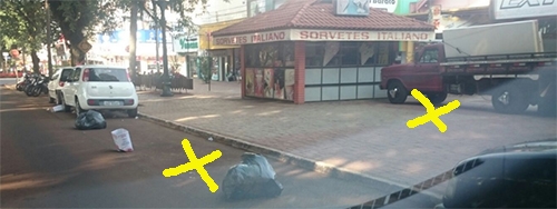 Dois flagrantes num local só, na manhã desta sexta-feira, no centro de Campo Mourão. Caminhão estaciona sobre o calçadão da av. Capitão Índio Bandeira e, ao mesmo tempo, sacos de lixo são usados para reserva vaga no estacionamento púbico.