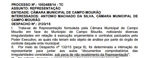 O Tribunal de Contas do Estado informou nesta quarta-feira que não recebeu representação da Câmara de Campo Mourão.