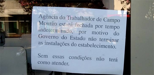 Olha só o recadinho que foi colocado na porta (fechada) da Agência do Trabalhador de Campo Mourão. O órgão está sem atendimento há mais de uma semana, quando mudou de endereço. A Secretaria de Estado do Trabalho e Desenvolvimento Social diz já dá pra atender ao público, visto que há internet. A prefeitura, que cede os funcionários, diz que sem reparos hidráulicos não há nem como usar os banheiros.