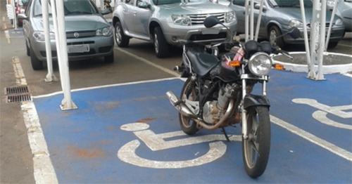 Motocicleta ocupa vaga reservada para cadeirante em supermercado de Campo Mourão. A partir deste ano, isso é passível de multa. Em tempo: Para usar vagas especais é preciso ter cartão fornecido pela Diretran.