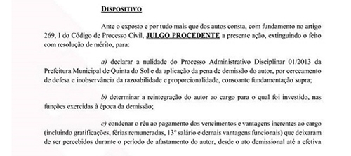 A prefeitura de Quinta do Sol terá que reintegrar o servidor Claudemir da Silva, que foi demitido em 2013.