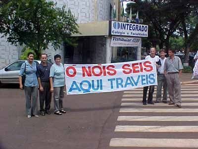 Enquanto a secretária dava posse aos diretores no Integrado, professores da APP-Sindicato tentavam protestar com faixas do lado de fora. Tentavam. A direção do Cies não permitiu que os manifestantes ficassem segurando faixas na calçada em frente à instituição. Ué, a calçada não é pública? A não ser que onde tem ensino privado a calçada é privatizada também...
