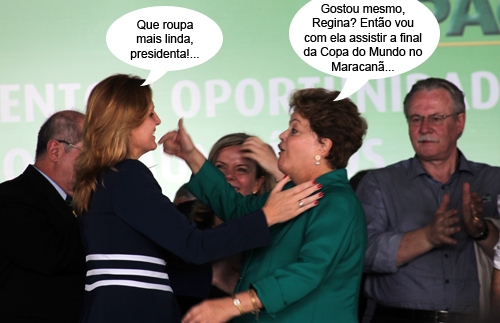 A presidenta Dilma Rousseff foi ao Maracanã entregar a Copa do Mundo vestindo uma roupa verde muito parecida com a que usou quando visitou Campo Mourão, ano passado. Será a mesma? Pode até não ser, mas que parece, parece! Aliás, até a calça preta que fez conjunto com a túnica é parecida com a usada em Campo Mourão. Olha aí, gastou dinheiro pra fazer a Copa e agora não tem pra renovar o guarda-roupa do Palácio...