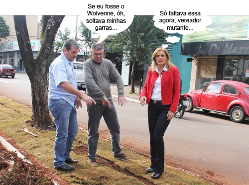 O clic é desta quinta-feira, quando a prefeita Regina Dubay chegou de Brasília e foi ver a grama esmeralda que está sendo plantada em canteiros centrais da av. Manoel Mendes de Camargo. O diretor de Meio Ambiente, Ademir Pezão, e o vereador Edílson Martins acompanharam. Ou seria Edilson Wolverine Martins?...