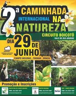 Tá a fim de fazer uma boa caminhada por áreas rurais de Campo Mourão? Então, anote aí na agenda que acontece no próximo dia 29 a 2ª Caminhada Internacional da Natureza. É o Circuito Boicotó - Vale do Rio Arurao, cheio de belezas naturais, inclusive ao salto Boi Cotó. Para participar não paga nada, mas pra quem quiser tem café da manhã rural a R$ 6 e almoço rural a R$ 16.