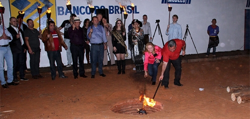 Olha aí a prefeita Regina Dubay se preparando para colocar o fogo no buraco número um da 24ª Festa Nacional do Carneiro no Buraco. Foi neste sábado à noite. Assim como no ano passado, o acendimento do primeiro buraco aconteceu na arena de rodeio, no encerramento do espetáculo "Guardiã do fogo".