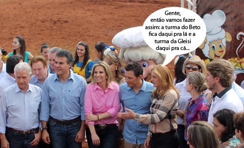 Na hora da retirada do tacho do buraco número um, o governador Beto Richa, a deputada Cida Borgheti (candidata a vice) e o deputado federal Rubens Bueno ficaram de um lado, enquanto a senadora Gleisi Hoffmann e o deputado Zeca Dirceu ficaram do outro. A prefeita Regina Dubay, como anfitriã, teve que ficar no meio. Pouco depois, misturou tudo. Aliás, ficou mais misturado que os legumes no tacho...