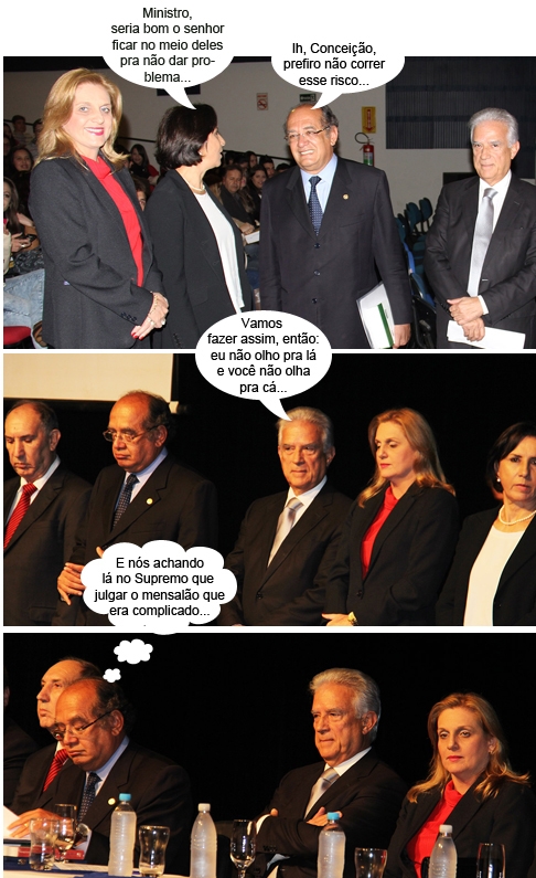 Os cliques são desta sexta-feira, no Teatro Municipal, onde o ministro Gilmar Mendes, do STF, proferiu palestra para alunos de direito do Integrado. A professora Conceição Baer Montans, a prefeita Regina Dubay e o deputado federal Rubens Bueno aparecem ao lado dele durante o evento.