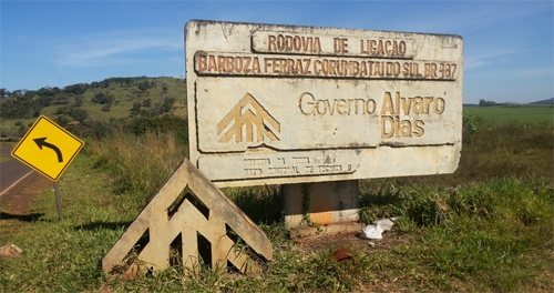 Por causa da legislação eleitoral, os governos estadual e federal têm que retirar placas de suas obras. Não pode nada. Já o senador Álvaro Dias, que é candidato a reeleição, tem seu nome espalhado por rodovias por obras feitas há mais de 20 anos, quando foi governador do Estado. São placas de concreto, todas pomposas. Essa aí fica entre Barbosa Ferraz e Corumbataí do Sul. Hummmm, será que ser for de concreto pooooode?...