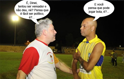 O deputado Douglas Fabrício aproveitou o jogo da seleção brasileira de másters, sexta-feira, para bater um papo com o ex-atacante Dinei, que fez fama no Corinthians. Dinei, aliás, foi candidato a vereador em São Paulo em 2012, mas não elegeu. Fez mais de 9 mil votos, só que o PDT não conseguir o coeficiente eleitoral. Ah, fazer gols era mais fácil...