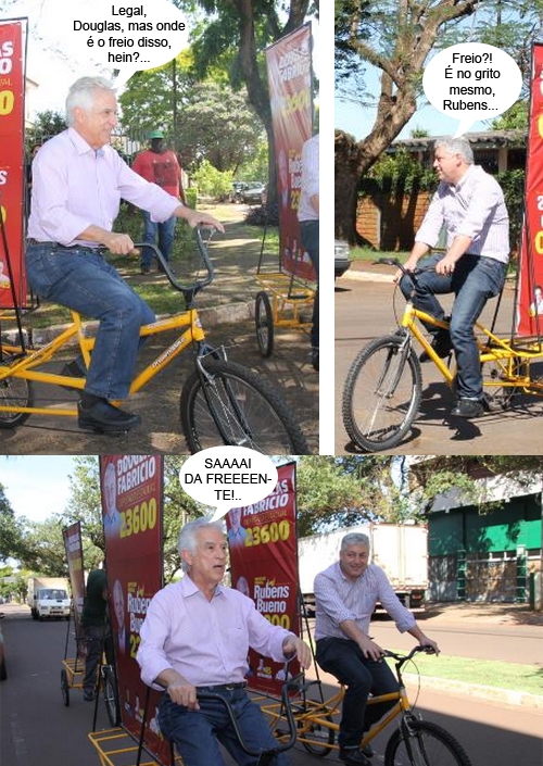 Os cliques são desta quinta-feira, quando os deputados Rubens Bueno (federal) e Douglas Fabrício (estadual) participaram de uma "bicicleata" por ruas do centro de Campo Mourão. Eles seguiram de bicicletas e os correlegionários foram a pé a atrás. Viu só, em evento de "sem-carros", quem tem bike é deputado...