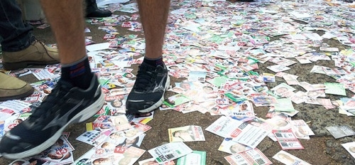 A Justiça Eleitoral não quer saber de santinhos jogados em frente às sessões de votação de Campo Mourão.