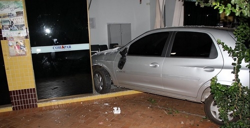 Um carro invadiu o escritório regional da Cohapar durante a madrugada desta sexta-feira. Isso em plena rua Mato Grosso, entre as avenidas Irmãos Pereira e Capitão Índio Bandeira. Além de arrebentar a porta de entrada, o Celta quebrou uma parede divisória. O motorista deu no pé, mas os documentos do veículo ficaram no carro. E aí, o Celtinha tava no limite correto de velocidade ou não?...