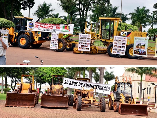 Com o grupo de assentados enchendo de faixas com cobranças à prefeitura de Peabiru, o prefeito Claudinei Minchio não pensou duas vezes. Colocou máquinas, ônibus e caminhões na frente, com faixas destacando as conquistas do município em dois anos. Aproveitou e também colocou a frota antiga em exposição, com uma faixa indicando o que a prefeitura tinha adquirido em 20 anos de gestões anteriores. Ah, se dá pra alfinetar, por que não alfinetar?...