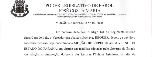 Mais uma Câmara de Vereadores da região está propondo moção de repúdio aos projetos do governo do Estado que paralisaram a educação.