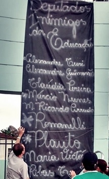 Professores do colégio estadual General Carneiro, de Roncador, improvisaram uma lista na estrada da escola com os nomes dos deputados que votaram a favor do "tratoraço" do governo. O painel imita um quadro negro e tem o título "Deputados inimigos da Educação". Entre os nomes, deputados que foram bem votados no município e, é claro, o mourãoense Márcio Nunes. Ô início de mandato, sô!...