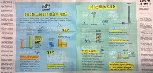 "A verdade sobre a educação no Paraná" é o título da publicidade que ocupa duas páginas de varios jornais do Paraná.