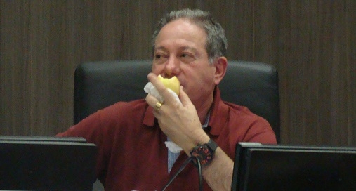 O vereador Eraldo Teodoro inovou na sessão desta segunda-feira. A certa altura da reunião, pegou uma garrafa térmica e encheu um copo com um líquido branco. Disse que era vitamina. Pouco depois das 22h, quando a sessão se encaminhava para o fim, retirou um enorme maçã pra comer. Alegou que a reunião foi muito longa e precisava se alimentar. A sessão terminou às 22h10. Olha aí, podiam incluir no regimento interno um intervalo pra merenda...