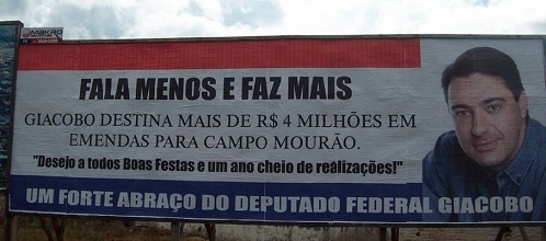 O deputado federal Fernando Giacobo mandou instalar outdoors por Campo Mourão dizendo que destinou R$ 4 milhões em emendas parlamentares para o município. "Fala menos e faz mais", destaca a propaganda. Agora, cá pra nós: quem falou que estava certa a liberação do dinheiro para a duplicação da saída pra Maringá foi ele, não foi?...