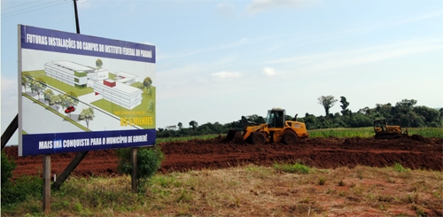 A prefeitura Goioerê começou a terraplanagem do terreno às margens da PR-180, onde será construída a Unidade Descentralizada do Instituto Federal do Paraná. No próximo dia 20 acontece cerimônia para assinatura da ordem de serviços para execução da primeira parte do projeto. A previsão é que já na semana que vem a empreiteira comece a edificação do primeiro bloco, que terá mais de 2 mil m2. Tá pensando o quê!...