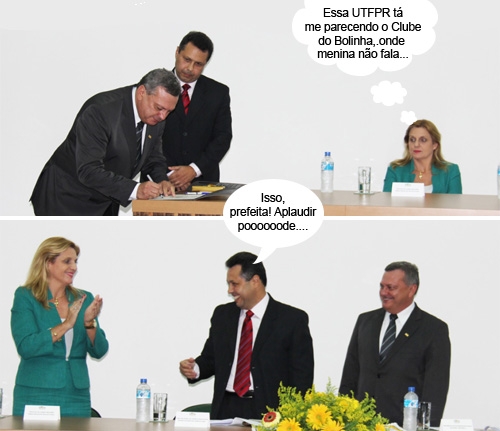 Os cliques são desta quinta-feira, quando o reitor da UTFPR, Carlos Eduardo Cantarelli, veio dar posse ao novo reitor do campus de Campo Mourão, Heron dos Santos Lima. A prefeita Regina Dubay esteve por lá. Mas nada de discurso dela, não. Só o ex-diretor Narci Nogueira, o novo diretor e o reitor tiveram direito a fala. Regina entrou muda e saiu calada...