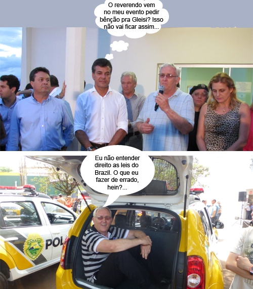 A foto da brincadeira do reverendo Richard Dickerson “experimentando” as novas viaturas da Polícia Militar a gente já tinha mostrado ontem. Agora vem a versão com balãozinho, junto com o clic em que ele faz uma oração durante a visita do governador Beto Richa, quando incluiu um pedido de bênçãos à ministra Gleisi Hoffmann.
