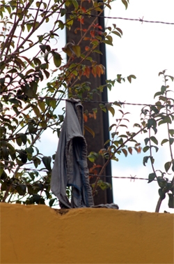 Olha só o que foi aparecer enroscado no arame farpado sobre o muro do estádio Roberto Brzezinski: uma cueca! Isso ao lado do portão de entrada. Só não pergunte como ela foi parar lá. Aliás, dá até arrepio só de pensar no que pode ter acontecido...