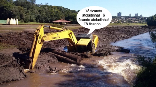 A retroescavadeira que retira a terra do lago assoreado do Parque do Lago atolou de novo.