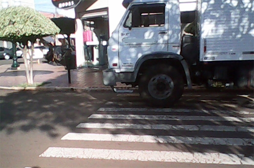 "Encontrei este caminhão em cima da faixa de pedrestre, ontem, por volta das 16h. Todos que queriam passar de um lado para o outro tinham que sair da faixa por causa deste caminhão".