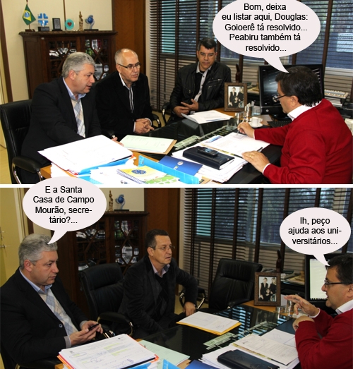Os cliques são desta segunda-feira, quando o secretário de Estado Michele Caputo (Saúde) recebeu diretores da Santa Casa de Goioerê e o prefeito de Peabiru, Claudinei Minchio. O deputado Douglas Fabrício acompanhou tudo. Peabiru conseguiu a elevação do posto de saúde e terá mais uma equipe de atenção básica. Já para Goioerê foi assumido o compromisso de ampliação do hospital filantrópico. Hummmm, mas assinaram ata ou não?...