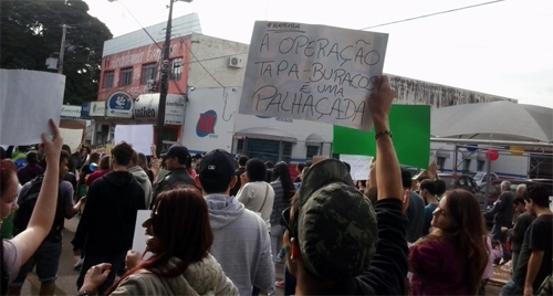 “Imagem que registrei do meio da passeata, mostrando cartaz que passou despercebido durante a manifestação em Campo Mourão, mas que protesta quanto a uma causa local. O que dirá o solitário manifestante sobre os buracos que certamente aparecerão depois de toda essa chuva?” Vainer
