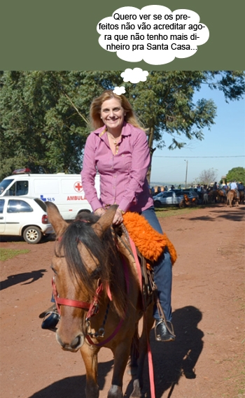 O clic é deste domingo, quando aconteceu a 1ª Cavalgada do Carneiro no Buraco. A prefeita Regina Dubay foi ao CTG, onde aconteceu a “largada” e deu uma voltinha num do cavalo. Olha aí, se precisar apertar o cinto pra aumentar os repasses à Santa Casa, nada como um “veículo oficial” mais econômico...
