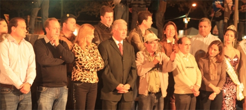 O clic é da abertura da 23ª Festa Nacional do Carneiro no Buraco, nesta terça-feira à noite. Após os discursos de praxe, as autoridades fizeram uma caminhada pelo Parque de Exposições. A prefeita Regina Dubay foi à frente, ao lado do “primeiro-damo” Laércio Dubay, da rainha da festa e da miss Paraná.
